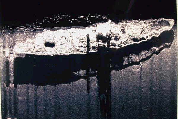 Wreck of Steamer Portland discovered by NOAA Researchers Sophisticated side scanning sonar has located the 104 year old wreck of the Portland, Maine to Boston steamer "Portland.". To keep the site safe from treasure hunters, NOAA scientists disclosed that wreckage was found somewhere on Stellewagen Bank , 40 miles seaward of Boston. The entire bank is classified as a National Marine Sanctuary. Use your Back Button to return here from high resolution images. In winter gale on Nov. 26, 1898 the Portland, Maine to Boston steamer, "Portland" sank with no survivors from her crew and 192 passengers . She was sighted battling the storm by passing skippers from as far north as Gloucester to Cape Cod 60 miles to the south. Her resting place on Stellwagen Bank remained a mystery until discovered on August 2002 by NOAA researchers. High Resolution Image The following photos on this page and high resolution links are NOAA credits.